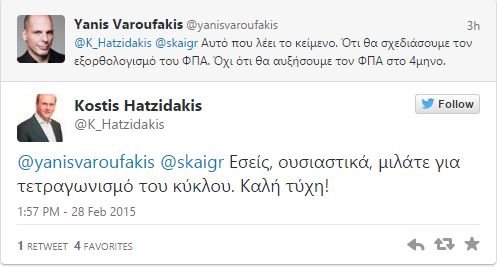 Διαδικτυακή αντιπαράθεση του υπουργού Οικονομικών Γιάνη Βαρουφάκη με τον βουλευτή της ΝΔ Κωστή Χατζηδάκη προκάλεσε η δήλωση του κ. Βαρουφάκη για τον ΦΠΑ στη συνέντευξή του στον ΣΚΑΪ. Μιλώντας νωρίτερα στον ΣΚΑΪ, ο βουλευτής της ΝΔ αμφισβήτησε όσα είπε ο κ. Βαρουφάκης στη συνέντευξή του στον σταθμό ΣΚΑΪ,, λέγοντας ότι η χώρα είναι υποχρεωμένη βάσει της συμφωνίας με τους εταίρους να αυξήσει το χαμηλό συντελεστή ΦΠΑ.