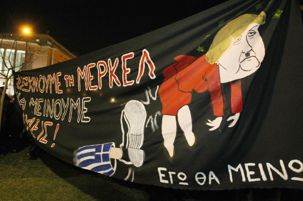Μπορεί εκείνη να είπε στον Ομπάμα προχθές ότι παρ' ολίγον να ξεχάσει τους Έλληνες, οι Σαλονικείς όμως σίγουρα δεν την ξεχνούν με τίποτα. Τις έφτιαξαν μάλιστα κι ένα πανό στη βραδιά των διαδηλώσεων με "ανάσα αξιοπρέπειας" που την δείχνει να ... ίπταται μετά από μία μεγαλοπρεπή ελληνική κλωτσιά στα τροφαντά της οπίσθια.