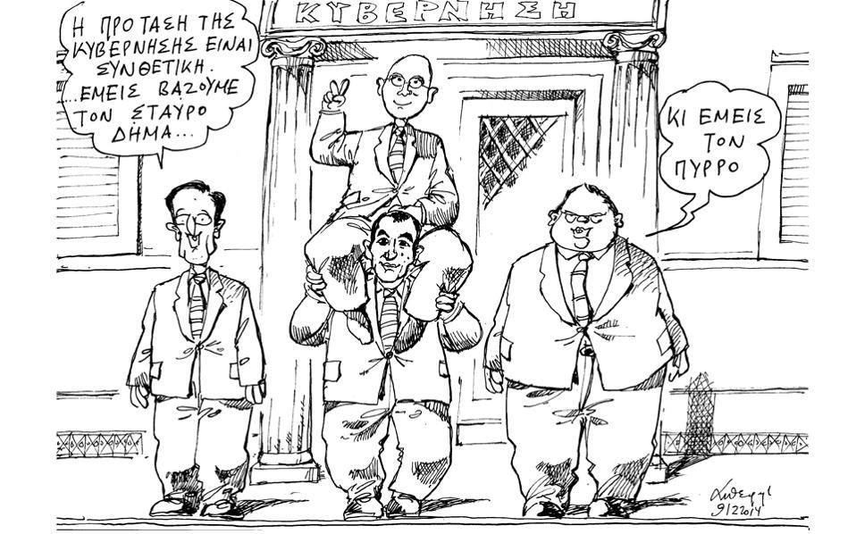 Οι σκιτσογράφοι έχουν το δικό τους τρόπο να περιγράφουν την επικαιρότητα. Στην περίπτωση της πρότασης Δήμα για την προεδρία της Δημοκρατίας οι κορυφαίοι του είδους Πετρουλάκης και Χαντζόπουλος "κατέθεσαν" τα εξής: