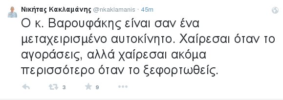 Την Παρασκευή, Γερμανός βουλευτής σε ειρωνική τοποθέτηση στη βουλή, ρώτησε τους συναδέλφους του αν θα αγόραζαν μεταχειρισμένο αυτοκίνητο από τον Αλέξη Τσίπρα ή τον Γιάνη Βαρουφάκη. "Εγώ σίγουρα όχι", απάντησε από μόνος του ο Βουλευτής. Το σχόλιο αναπαράγεται από τον Νικήτα Κακλαμάνη ο οποίος παρομοιάζει τον υπουργό Οικονομικών μεταχειρισμένο όχημα. Δείτε το tweet του βουλευτή της ΝΔ