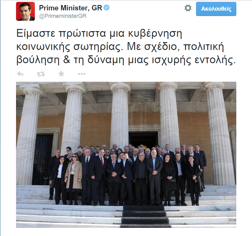 Καλός χρήστης του twitter αποδεικνύεται ο νέος Έλληνας Πρωθυπουργός που στέλνει καθημερινά τα μηνύματα του με ... τιτιβίσματα, που ξέρει πως βρίσκουν εύκολα τους αποδέκτες τους στη Γερμανία, τις Βρυξέλλες κι όπου αλλού χρειάζεται. Τελευταίο δείγμα το σημερινό μήνυμα, με πολλαπλούς αποδέκτες στο εξωτερικό.