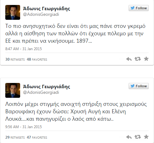 Με αφορμή τα όσα διαδραματίστηκαν μεταξύ Βαρουφάκη - Ντάισελμπλουμ, ο πρώην Υπουργός Αδωνις Γεωργιάδης "σχολιάζει" στο twitter. Μάλιστα παρομοίασε την αντίληψη που επικρατεί στις διαπραγματεύσεις, με τον ελληνοτουρκικό πόλεμο του 1897, που κατέληξε σε ήττα της Ελλάδας και στην υποβολή της σε διεθνή οικονομικό έλεγχο ύστερα από απαίτηση της Γερμανίας...