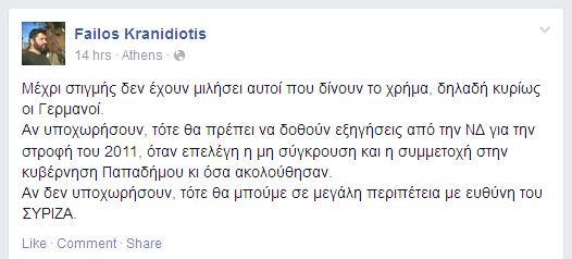 Με ανάρτησή του στον προσωπικό του λογαριασμό στο Facebook, ο Φαήλος Κρανιδιώτης, φίλος και συνεργάτης του τέως πρωθυπουργού Αντώνη Σαμαρά, υπογραμμίζει ότι αν οι δανειστές υποχωρήσουν, η ΝΔ θα πρέπει να δώσει εξηγήσεις για τη συμμετοχή της στην κυβέρνηση Παπαδήμου και την τακτική της μη σύγκρουσης.