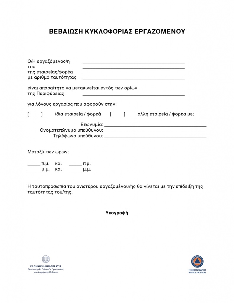 Βεβαίωση Ελεύθερης Κυκλοφορίας Εργαζόμενου (PDF)