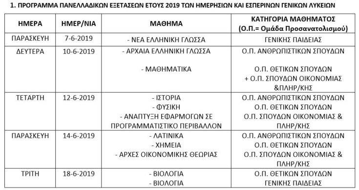 Από το υπουργείο Παιδείας ανακοινώθηκε ότι με Υπουργικές Αποφάσεις καθορίστηκε το πρόγραμμα των πανελλαδικών εξετάσεων 2019 Γενικών Λυκείων και Επαγγελματικών Λυκείων 2019.