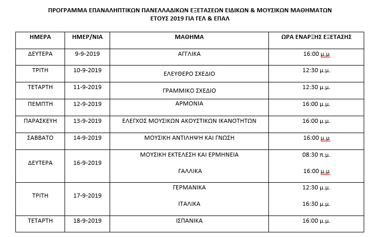 Α2. Καθορίζουμε το πρόγραμμα των επαναληπτικών πανελλαδικών εξετάσεων των Ειδικών Μαθημάτων και των Μουσικών Μαθημάτων έτους 2019 των υποψηφίων ΓΕΛ και ΕΠΑΛ για εισαγωγή σε Σχολές και Τμήματα για τα οποία απαιτείται εξέταση σε ειδικά μαθήματα, ως ακολούθως: