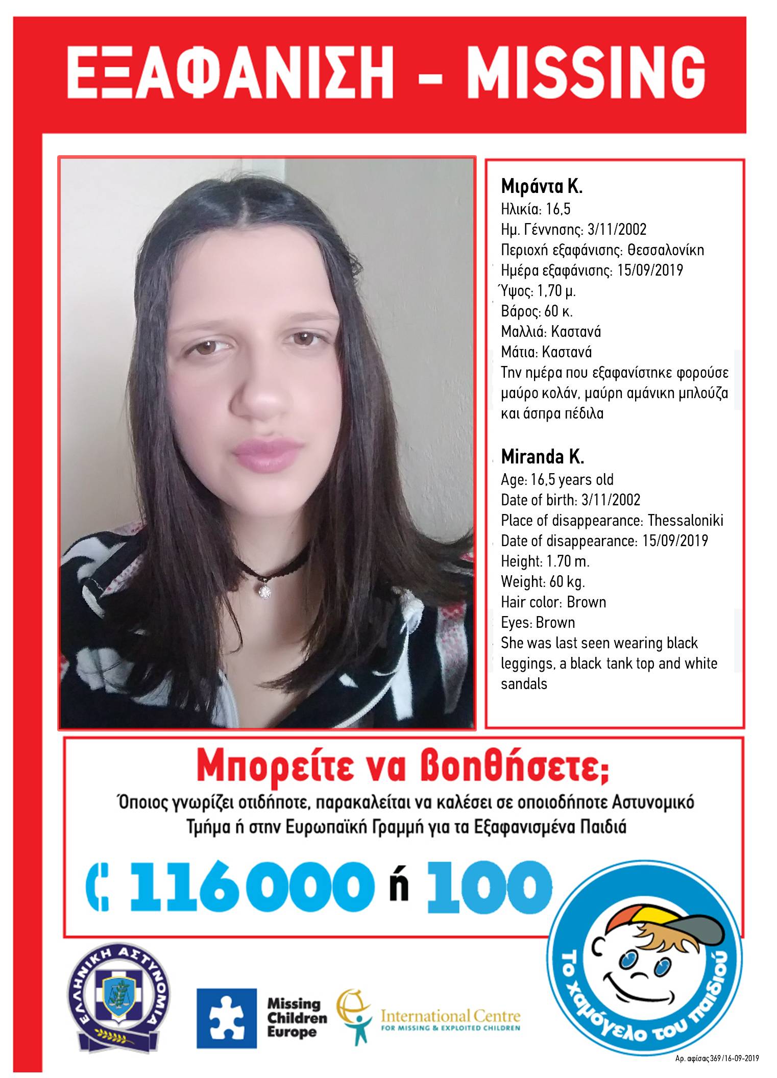 Το Χαμόγελο του Παιδιού καλεί οποιονδήποτε έχει κάποια πληροφορία, να επικοινωνήσει τηλεφωνικά με τις υπηρεσίες του, όλο το 24ωρο, στην «Ευρωπαϊκή Γραμμή για τα Εξαφανισμένα Παιδιά 116000», καθώς και σε όλα τα Αστυνομικά Τμήματα της χώρας.