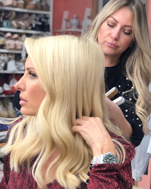 Η παρουσιάστρια κάνει τις τελευταίες διορθώσεις στο μακιγιάζ της, βάζει το αγαπημένο της ροζ κραγιόν και η κομμώτριά της της φτιάχνει τα μαλλιά της.