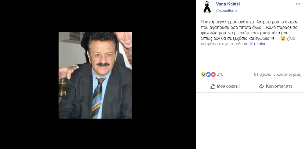 Την είδηση του θανάτου έκανε γνωστή μέσω του προσωπικού της λογαριασμού στο facebook η κόρη του Βάνα: «Ήταν η μεγάλη μου αγάπη, η λατρεία μου, ο άντρας που αγαπούσα όσο τίποτα άλλο… Καλό παράδεισο, ψυχούλα μου, να με σκέφτεσαι, μπαμπάκα μου. Όπως δεν θα σε ξεχάσω και εγώ».