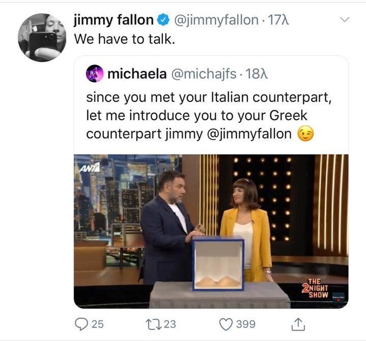 Ο Τζίμι Φάλον, μέσα από τον προσωπικό του λογαριασμό στο twitter ενημερώθηκε για την εκπομπή του Γρηγόρη Αρναούτογλου και έκανε repost μια σχετική φωτογραφία από την πετυχημένη εκπομπή του ANT1.