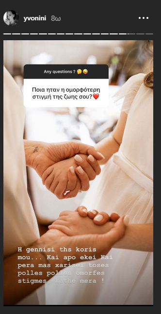 “Η γέννηση της κόρης μου! Και από εκεί και πέρα μας χαρίζει τόσες πολλές, πολλές όμορφες στιγμές, κάθε μέρα!”, σχολίασε χαρακτηριστικά.