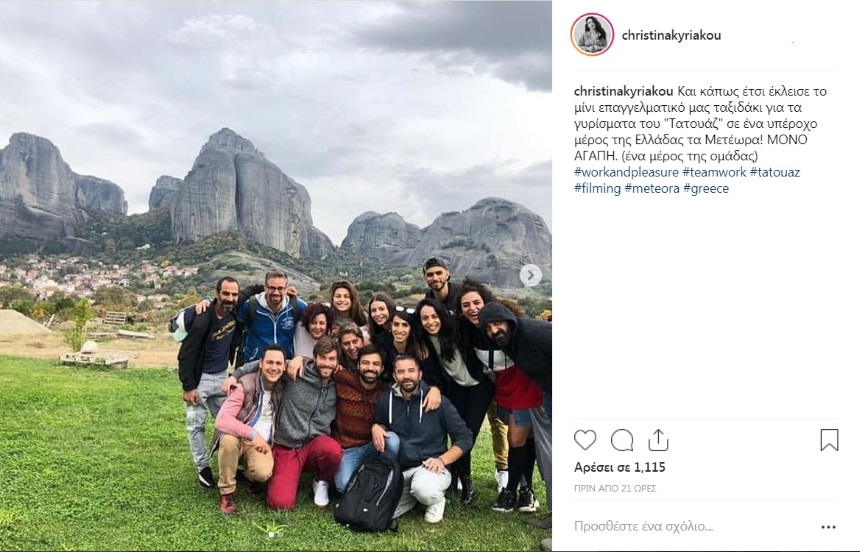 «Και κάπως έτσι έκλεισε το μίνι επαγγελματικό μας ταξιδάκι για τα γυρίσματα του “Τατουάζ” σε ένα υπέροχο μέρος της Ελλάδας τα Μετέωρα! ΜΟΝΟ ΑΓΑΠΗ. (ένα μέρος της ομάδας) #workandpleasure #teamwork #tatouaz #filming #meteora #greece», έγραψε η ίδια και δημοσίευσε μία φωτογραφία με τους συνεργάτες της.