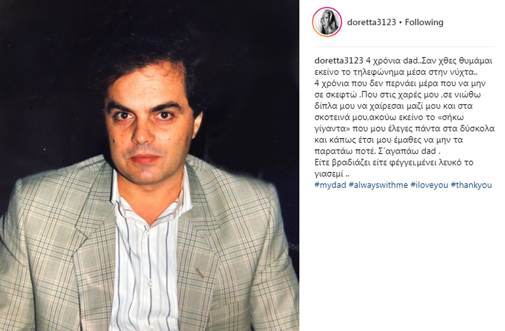 «4 χρόνια dad.. Σαν χθες θυμάμαι εκείνο το τηλεφώνημα μέσα στην νύχτα.. 4 χρόνια που δεν περνάει μέρα που να μην σε σκεφτώ .Που στις χαρές μου ,σε νιώθω δίπλα μου να χαίρεσαι μαζί μου και στα σκοτεινά μου,ακούω εκείνο το «σήκω γίγαντα» που μου έλεγες πάντα στα δύσκολα και κάπως έτσι μου έμαθες να μην τα παρατάω ποτέ. Σ´αγαπάω dad. Είτε βραδιάζει είτε φέγγει,μένει λευκό το γιασεμί ..»., έγραψε χαρακτηριστικά.