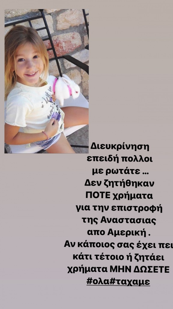 «Διευκρίνηση επειδή πολλοί με ρωτάτε… Δεν ζητήθηκαν ΠΟΤΕ χρήματα για την επιστροφής της Αναστασίας από την Αμερική. Αν κάποιος σας έχει πει κάτι τέτοιο ή ζητάει χρήματα ΜΗΝ ΔΩΣΕΤΕ. Όλα τα ‘χαμε», έγραψε χαρακτηριστικά.