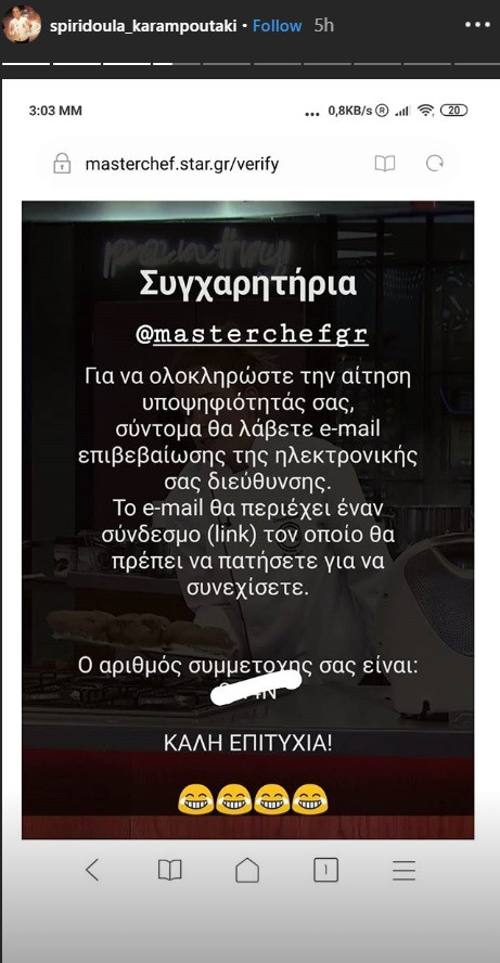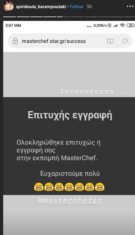 Η Σπυριδούλα Καραμπουτάκη έκανε μία ανάρτηση στον προσωπικό της λογαριασμό στο Instagram, με μία φωτογραφία από την πλατφόρμα αιτήσεων υποψηφιότητας του MasterChef και έκανες πολλούς να αναρωτηθούν αν ξανά μπαίνει στο παιχνίδι.