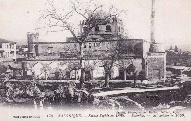 Στην σπάνια φωτογραφία από το βιβλίο του Adolf Hermann Struck, απεικονίζεται ο ναός της Αγίας Σοφίας στην Θεσσαλονίκη με άγνωστη ημερομηνία.