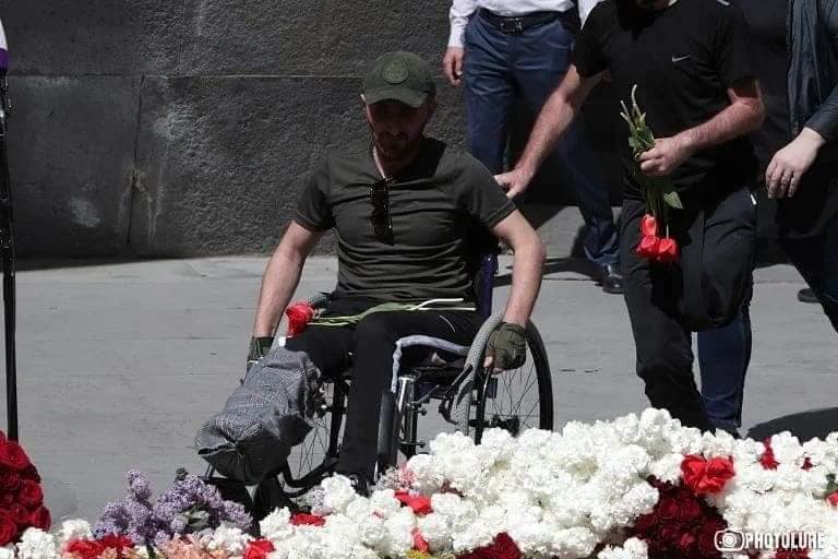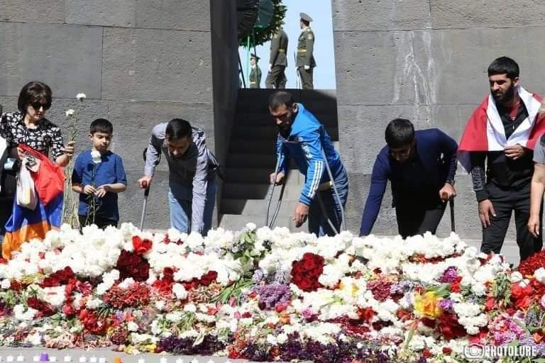 Συγκλονιστικές στιγμές στην πρωτεύουσα της Αρμενίας στο Γερεβάν, όταν αρμένιοι μαχητές, πολλοί από αυτούς ανάπηροι, κατέθεσαν λουλούδια στο μνημείο για τα θύματα της γενοκτονίας του 1915 από την Οθωμανική Αυτοκρατορία.