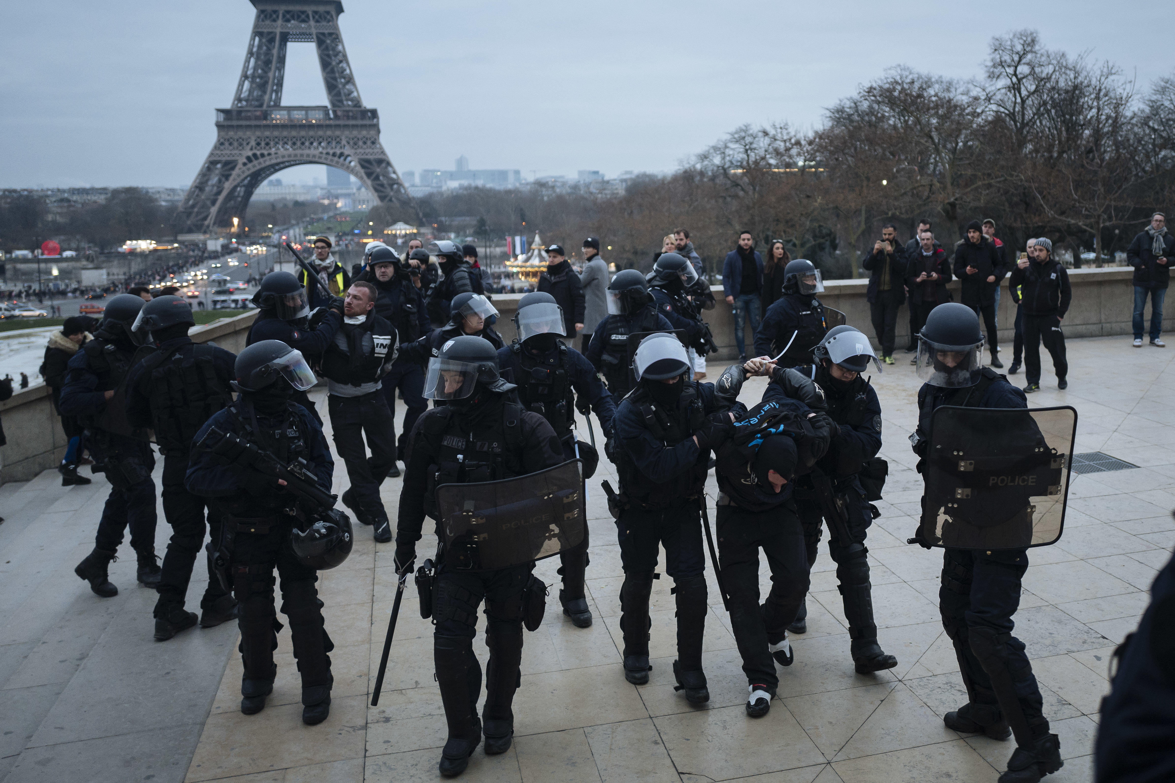 Στο Παρίσι, η αστυνομία χρησιμοποίησε χημικά σε μια προσπάθεια να ελέγξει την κατάσταση και προχώρησε σε συλλήψεις στην περιοχή γύρω από τον Πύργο του Άιφελ.