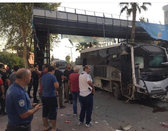 Το τηλεοπτικό δίκτυο CNN Turk μετέδωσε εικόνες από το λεωφορείο το οποίο έχει υποστεί σοβαρές ζημιές αλλά και από άλλα οχήματα γύρω από αυτό τα οποία βρίσκονταν κάτω από μία πεζογέφυρα στην περιοχή Γιουρεγκίρ στα Άδανα.