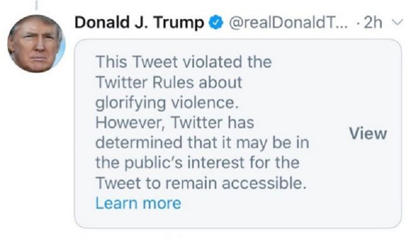 Στη θέση της ανάρτησης του Αμερικανού προέδρου αυτή τη στιγμή αναγράφεται η ανακοίνωση της εταιρείας Twitter: "Αυτό το Tweet παραβίασε τους Κανόνες του Twitter σχετικά με τον εγκωμιασμό πράξεων βίας. Ωστόσο, το Twitter έκρινε ότι το Tweet μπορεί να παραμείνει προσβάσιμο για λόγους δημόσιου συμφέροντος".