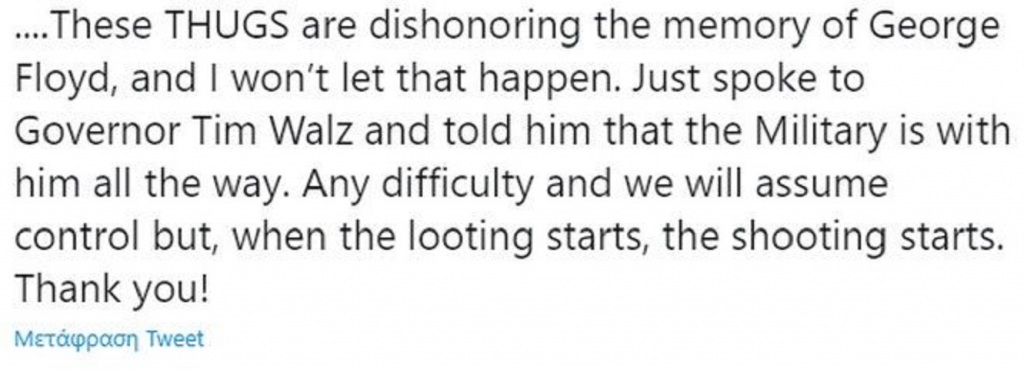 "Αυτά τα κακοποιά στοιχεία αμαυρώνουν τη μνήμη του Τζορτζ Φλόιντ και δεν θα επιτρέψω αυτό να συμβεί. Μόλις μίλησα με τον κυβερνήτη Tim Walz και του είπα ότι ο Στρατός είναι μαζί του. Οποιαδήποτε δυσκολία προκύψει θα έχουμε τον έλεγχο, αλλά, όταν ξεκινούν οι λεηλασίες, ξεκινούν και οι πυροβολισμοί. Ευχαριστώ!"