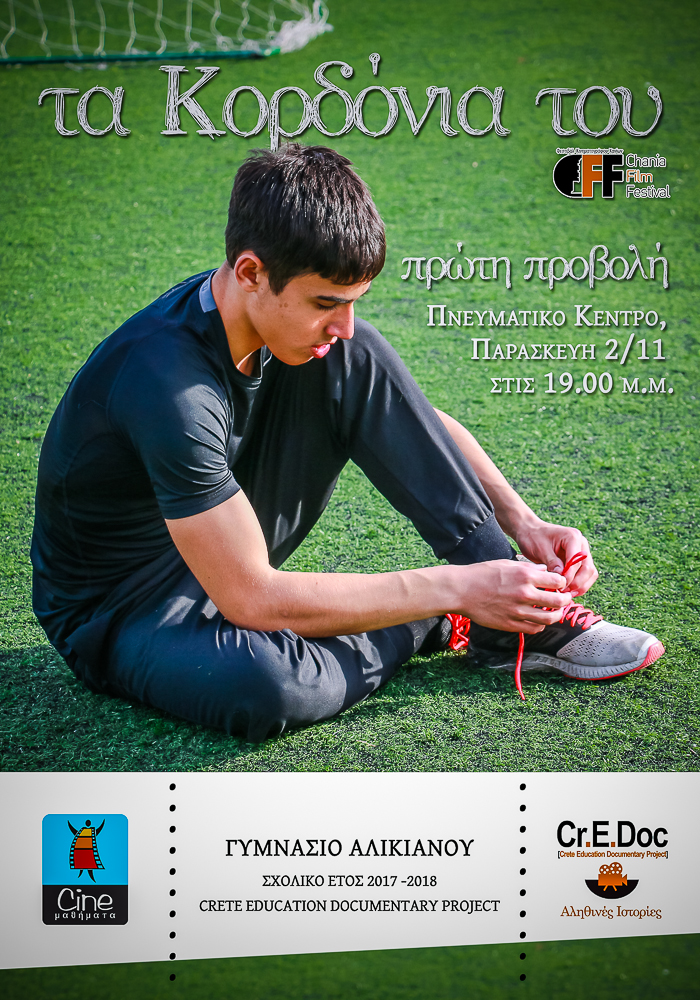 Το Γυμνάσιο Αλικιανού την Παρασκευή 2 Νοεμβρίου 2018 και ώρα 19:00 μ.μ. στο Πνευματικό Κέντρο Χανίων προβάλει την ταινία του με τίτλο: «Τα κορδόνια του». Πρόκειται για την τρίτη κατά σειρά ταινία- ντοκυμαντέρ του Γυμνασίου Αλικιανού, η οποία δημιουργήθηκε στο πλαίσιο της εκπαιδευτικής δράσης «cine-mathimata» του 6ου Φεστιβάλ Κινηματογράφου Χανίων.