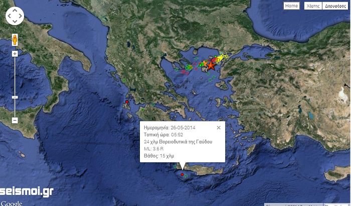 Σεισμική δόνηση 3,6 βαθμών της κλίμακας Ρίχτερ σημειώθηκε στις 05:52 το πρωί της Δευτέρας 24 χιλιόμετρα Βορειοδυτικά της Γαύδου σύμφωνα με το seismoi.gr . Το εστιακό βάθος εντοπίζεται στα 15 χιλιόμετρα ενώ από τον σεισμό δεν έχουν αναφερθεί υλικές ζημιές. Παρακάτω μπορείτε να δείτε τα χαρακτηριστικά του σεισμού,
