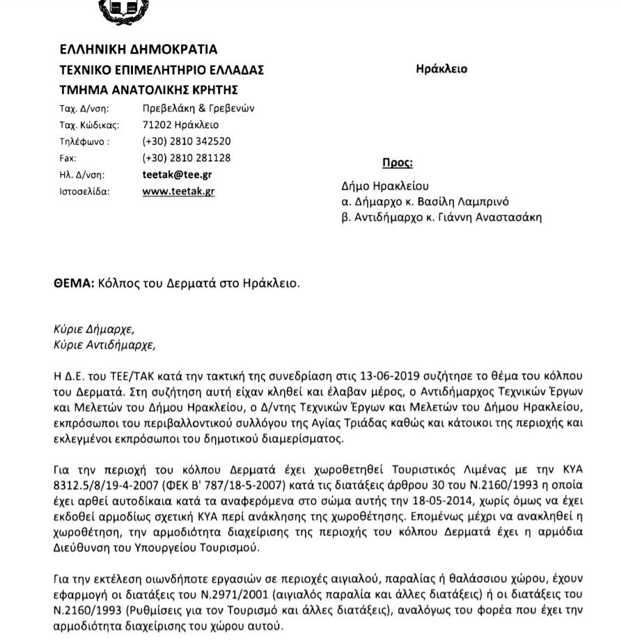 Επιστολή μέσω της οποίας εκφράζει τις ανησυχίες του για τον Κόλπο του Δερματά απέστειλε στον Δήμο Ηρακλείου το Τεχνικό Επιμελητήριο Ανατολικής Κρήτης.