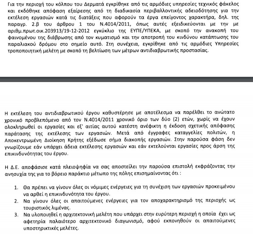 Μεταξύ άλλων το ΤΕΕ/ΤΑΚ ζητά από τον Δήμο Ηρακλείου να γίνουν όλες οι απαραίτητες ενέργειες για τον αποχαρακτηρισμό της περιοχής ως τουριστικός λιμένας.