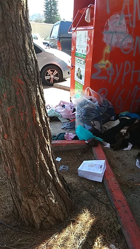 Ξεχειλίζουν από ρούχα, οι ειδικοί, κόκκινοι κάδοι ανακύκλωσης που τα δέχονται, δημιουργώντας αλγεινή εικόνα. Οι φωτογραφίες τραβήχτηκαν από ακροάτρια του Ράδιο Κρήτη, έξω από το κοιμηττήριο της Νέας Αλικαρνασσού, η οποία κάνει λόγο για ντροπή.