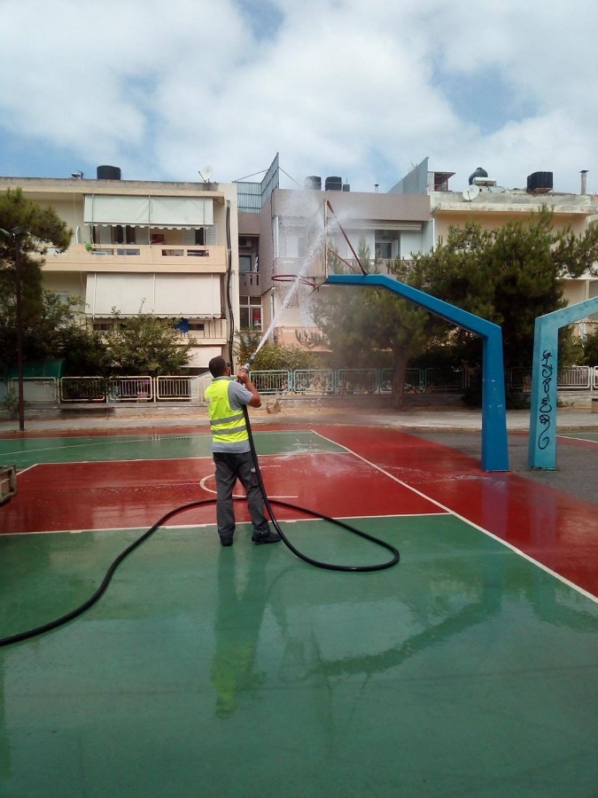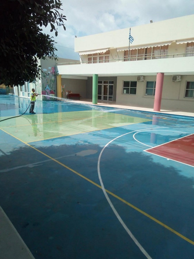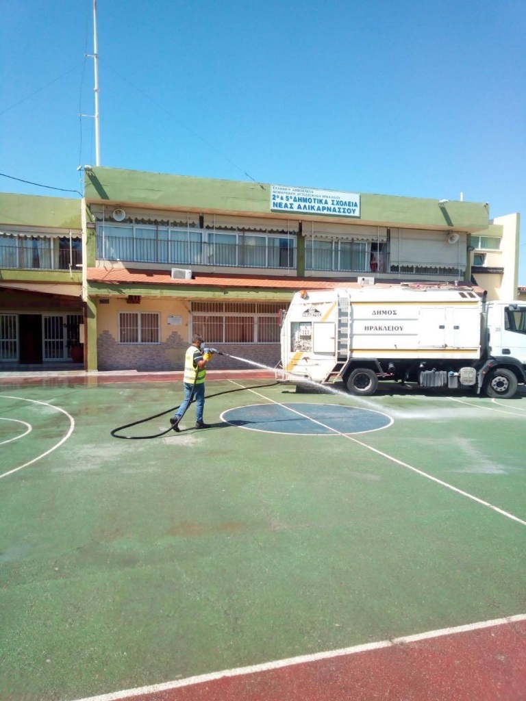 Την ίδια ώρα, η υπηρεσία καθαριότητας του Δήμου Ηρακλείου, ξεκίνησε το πλύσιμο στους αύλειους χώρους των σχολείων της πόλης και την προληπτική απολύμανση με ψεκασμούς του αστικού εξοπλισμού στα δημοτικά.