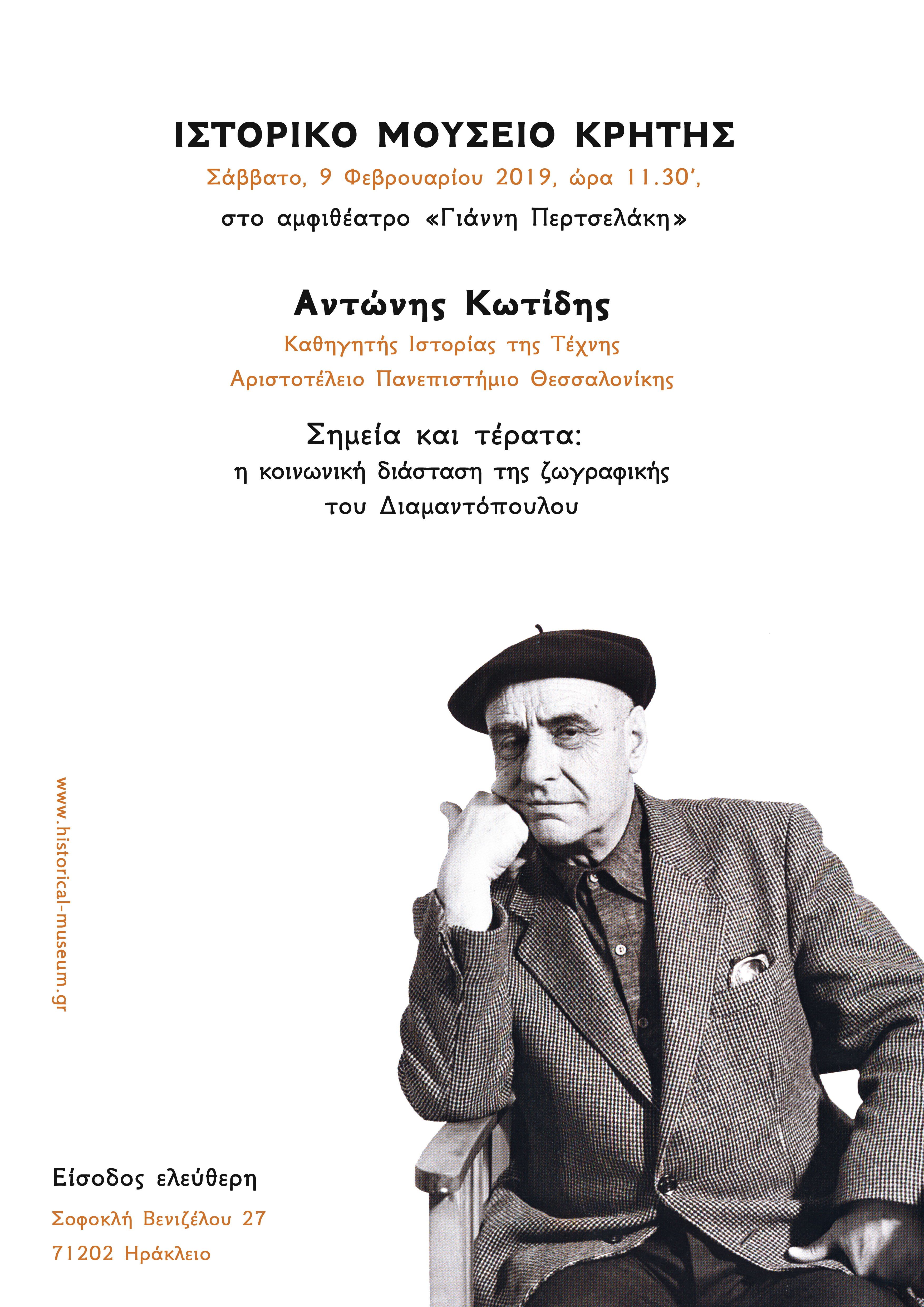 Λίγο πριν από την ολοκλήρωση της περιοδικής έκθεσης της Εταιρίας Κρητικών Ιστορικών Μελετών «ΤΕΡΑΤΟΛΟΓΙΕΣ. Από την Ιστορία του Ανθρώπου» στο Ιστορικό Μουσείο Κρήτης, ο Αντώνης Κωτίδης, Ιστορικός της Τέχνης, θα μιλήσει στο φιλότεχνο κοινό της πόλης για Σημεία και τέρατα: Η κοινωνική διάσταση της ζωγραφικής του Διαμαντή Διαμαντόπουλου, το Σάββατο, 9 Φεβρουαρίου 2019, ώρα 11.30΄, στο αμφιθέατρο Γιάννη Περτσελάκη.