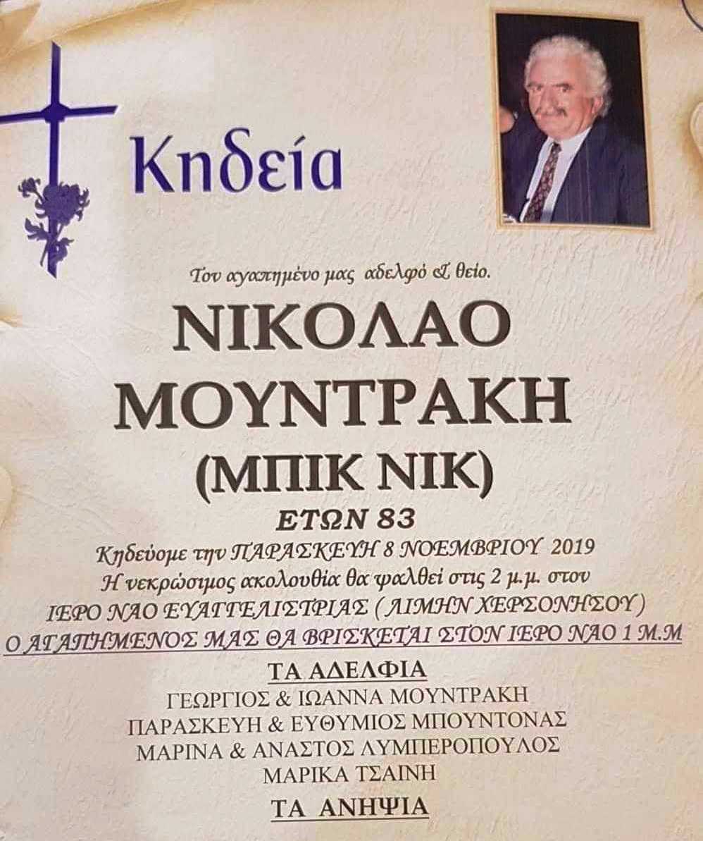 Ο Νίκος Μουντράκης, γνωστός και ως Μπικ Νικ, "έφυγε" από τη ζωή σε ηλικία 83 ετών, σκορπίζοντας τη θλίψη στην οικογένεια, στους φίλους, αλλά και σε ολόκληρη την κοινωνία της Χερσονήσου όπου ήταν ιδιαίτερα αγαπητός.