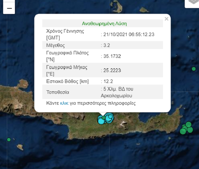 Το επίκεντρο εντοπίζεται στα 5 Χλμ. ΒΔ του Αρκαλοχωρίουτου Αρκαλοχωρίου και το εστιακό βάθος στα 12,2 χλμ.