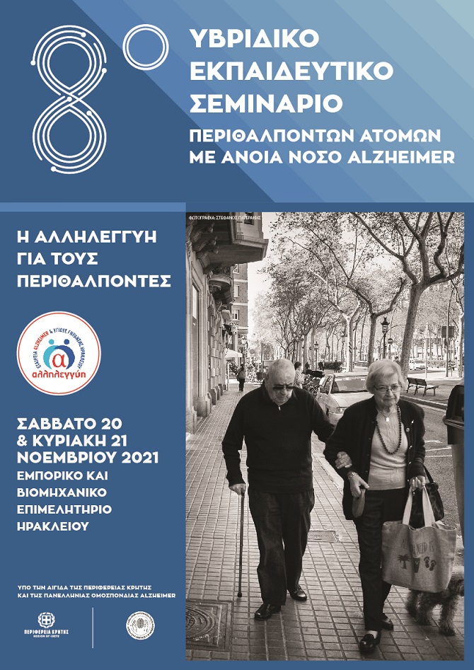 Υπό την αιγίδα της Περιφέρειας Κρήτης, η ΑΛΛΗΛΕΓΓΥΗ Ηρακλείου – εταιρεία για τη νόσο Alzheimer και την Υγιή Γήρανση – διοργανώνει το 8ο υβριδικό εκπαιδευτικό σεμινάριο Περιθαλπόντων και Επαγγελματιών Φροντιστών ατόμων με Άνοια. Το σεμινάριο θα πραγματοποιηθεί το Σάββατο 20 και την Κυριακή 21 Νοεμβρίου 2021 στο Εμπορικό και Βιομηχανικό Επιμελητήριο Ηρακλείου και διαδικτυακά.