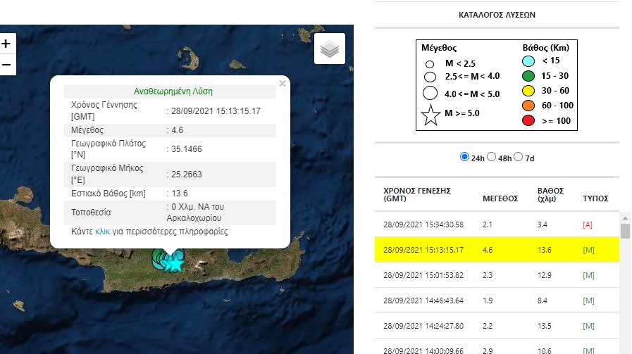 Ακόμα ένας δυνατός σεισμός εκδηλώθηκε στο Ηράκλειο, μεγέθους 4,6 βαθμών της κλίμακας Ρίχτερ, σύμφωνα με την αυτόματη λύση του Γεωδυναμικού Ινστιτούτου Αθηνών.