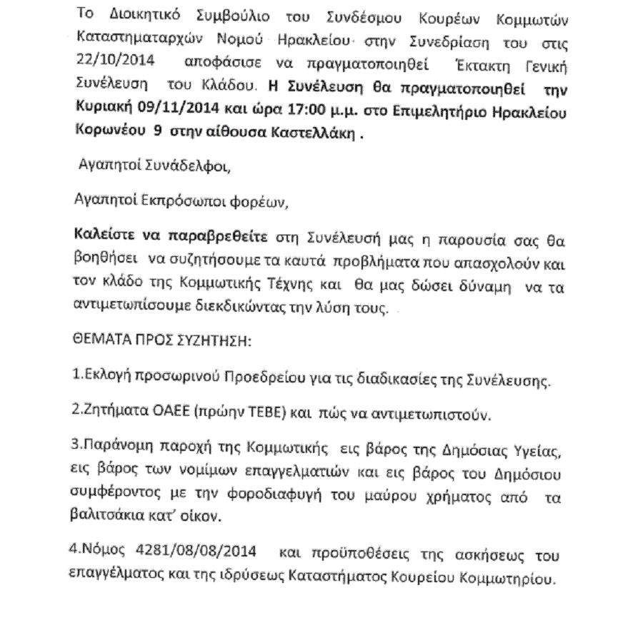 Έκτακτη Γενική Συνέλευση θα πραγματοποιηθεί από το Σύνδεσμο κουρέων κομμωτών καταστηματαρχών Ηρακλείου την Κυριακή 9 Νοεμβρίου στις 17:00 μετά από από απόφαση του διοικητικού συμβουλίου. Η συνέλευση θα πραγματοποιηθεί στο Επιμελητήριο Ηρακλείου στην αίθουσα Καστελάκη. Σε ανακοίνωση του συνδέσμου αναφέρεται: