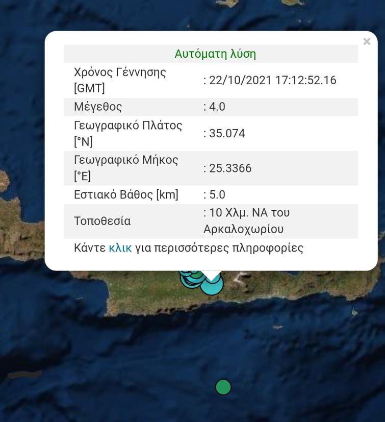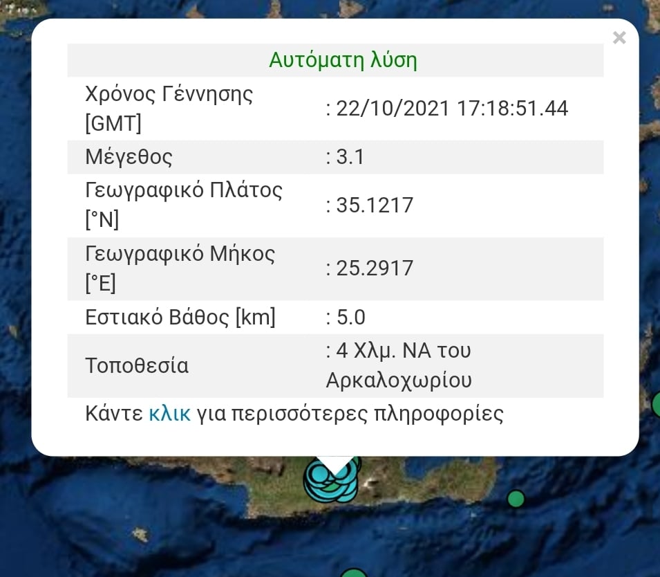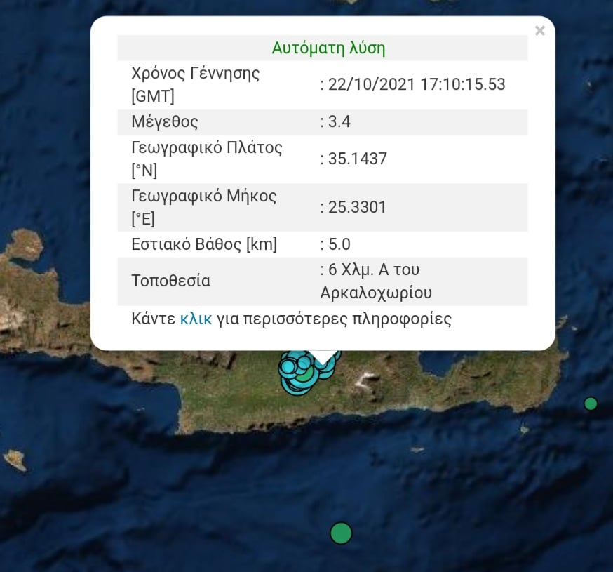 Δύο λεπτά νωρίτερα είχε καταγραφεί σεισμός 3.4 βαθμών της Κλίμακας Ρίχτερ, 6 χιλιόμετρα ανατολικά του Αρκαλοχωρίου, σε 5 χιλιόμετρα επίσης εστιακό βάθος.