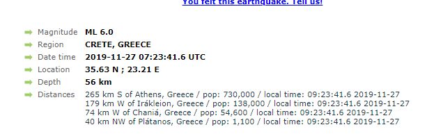 Εκ μέρους των τεσσάρων φορέων συγκρότησης του Εθνικού Σεισμολογικού Δικτύου, το Γεωδυναμικό Ινστιτούτο του Εθνικού Αστεροσκοπείου Αθηνών ανακοινώνει ότι σήμερα στις 09:23 ώρα Ελλάδος, οι σεισμογράφοι τους κατέγραψαν σφοδρή σεισμική δόνηση, με μέγεθος 6.1 βαθμών της Κλίμακας Ρίχτερ και σημειώθηκε 40 χιλιόμετρα Δυτικά των Χανίων, στη θαλάσσια περιοχή μεταξύ Κρήτης και Κυθήρων.