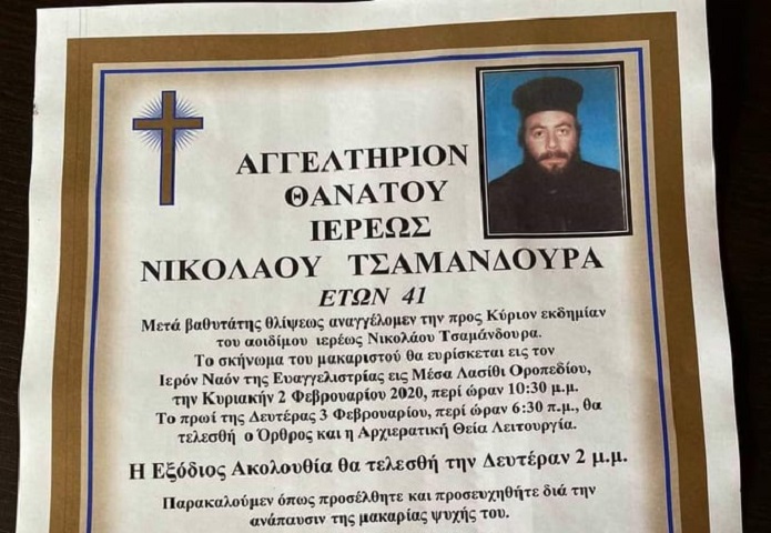 Συγκλονισμένη είναι η τοπική κοινωνία στο Οροπέδιο Λασιθίου από τον ξαφνικό χαμό του Ιερέα Νικόλαου Τσαμάνδουρα ο οποίος "έσβησε" στα 41 του χρόνια, σκορπώντας θλίψη.