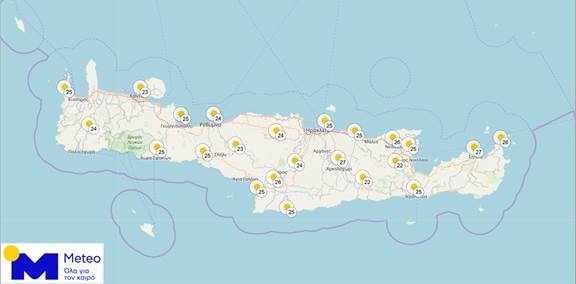 Όπως διακρίνεται και στον χάρτη, οι μέγιστες θερμοκρασίες την Κυριακή θα κυμανθούν από 23 ως 27 βαθμούς Κελσίου.
