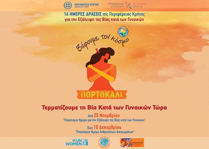 Συνεχίζονται οι δράσεις στα πλαίσια της 16ήμερης Εκστρατείας της Περιφέρειας Κρήτης «Βάφουμε τον Κόσμο Πορτοκαλί. Τερματίσουμε τη Βία κατά των Γυναικών ΤΩΡΑ», για την εξάλειψη της βίας κατά των γυναικών, την άρση των πολλαπλών διακρίσεων που αντιμετωπίζουν οι γυναίκες και την επαύξηση της ευαισθητοποίησης του κοινού, με ιδιαίτερη έμφαση στα μικρά παιδιά και τους νέους ανθρώπους. Σε συνδιοργάνωση με το Δήμο Ηρακλείου-ΔΕΠΙΣ Ηρακλείου, αύριο, Σάββατο 27 Νοεμβρίου 2021 και ώρα 11:00-2:00μ.μ πρόκειται να πραγματοποιηθούν δράσεις ευαισθητοποίησης και ενημέρωσης στο Αίθριο του Δημαρχείου Ηρακλείου (Λότζια).