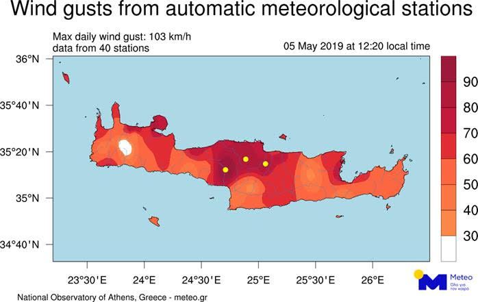 Πολύ ενισχυμένους νότιους ανέμους κατέγραψαν την Κυριακή 05/05 στην Κρήτη οι σταθμοί του Εθνικού Αστεροσκοπείου/meteo.gr όπως δίνεται και στον χάρτη των σταθμών που ακολουθεί (τα χρώματα δίνουν τις μέγιστες ριπές ανέμου, όπου σε αρκετές περιοχές ξεπέρασαν τα 90-100 km/h)