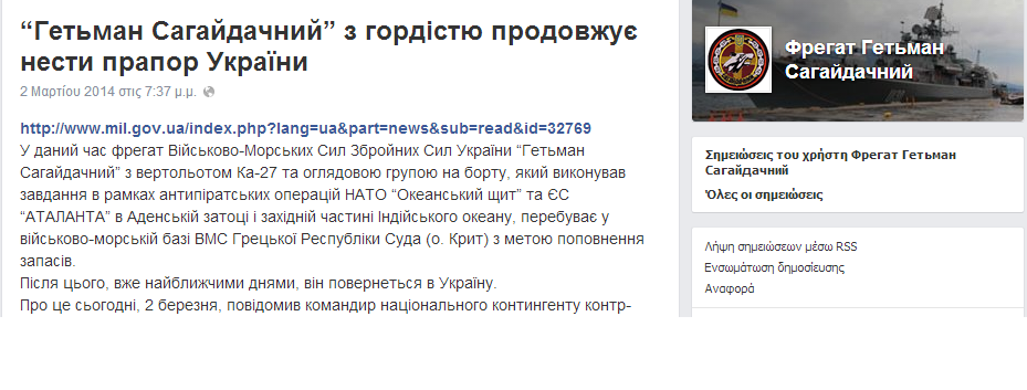Στο μεταξύ στην ιστοσελίδα της Ουκρανικής φρεγάτας στο FB τα μηνύματα των τελευταίων ωρών δίνουν το στίγμα του εμφυλιοπολεμικού κλίματος καθώς αρκετοί σχολιαστές έσπευσαν να επικροτήσουν τις φημολογούμενες επιλογές του πληρώματος ενώ δεν έλειψαν κι εκείνοι που τάχθηκαν αντίθετοι. Πάντως στο επίσημο κείμενο που ακολουθεί και το οποίο υπογράφει ο υποδιοικητής του πληρώματος αναφέρεται ότι "τα μέλη του πληρώματος παραμένουν πιστά στον όρκο που έδωσαν στην Ουκρανία και εκτελούν ευσυνείδητα τα καθήκοντά τους". Τονίζεται δε ότι όσα γράφτηκαν για έπαρση της "σημαίας του Αγίου Ανδρέα" στο πλοίο είναι εικασίες, που εξοργίζουν το πλήρωμα, καθώς ουδέποτε συνέβη κάτι τέτοιο. ... Η ημερομηνία της δημοσίευσης είναι : 2-3-2014 ώρα 19.37