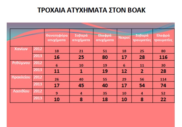 Στον επόμενο πίνακα αποτυπώνεται η τραγικότητα και η επικινδυνότητα του ΒΟΑΚ ανά περιοχή, χωρίς τα στοιχεία να περιλαμβάνουν τη χρονιά που διανύουμε.