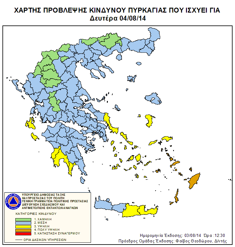 Υψηλός χαρακτηρίζεται για την Δευτέρα 4 Αυγούστου ο κίνδυνος για εκδήλωση πυρκαγιάς στους Νομούς Ηρακλείου και Λασιθίου. Σύμφωνα με τον χάρτη πρόβλεψης της Γενικής Γραμματείας Πολιτικής Προστασίας, ο βαθμός επικινδυνότητας για τους δύο αυτούς νομούς είναι στο 3. Η Πυροσβεστική συνιστά προσοχή και ζητά από τους πολίτες να μην κάνουν οποιαδήποτε ενέργεια η οποία θα μπορούσε να προκαλέσει πυρκαγιά.