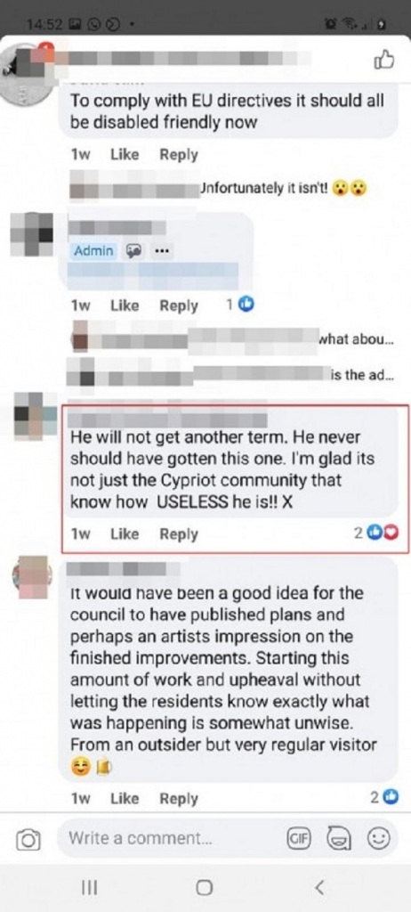 Συγκεκριμένα, σύμφωνα με το δημοσίευμα, μια 35χρονη βρετανίδα έχει συλληφθεί στην Κύπρο και αντιμετωπίζει επιβολή προστίμου 4,000 ευρώ, όταν χαρακτήρισε στο Facebook τον κοινοτάρχη Μανδριών «Useless (άχρηστο)».