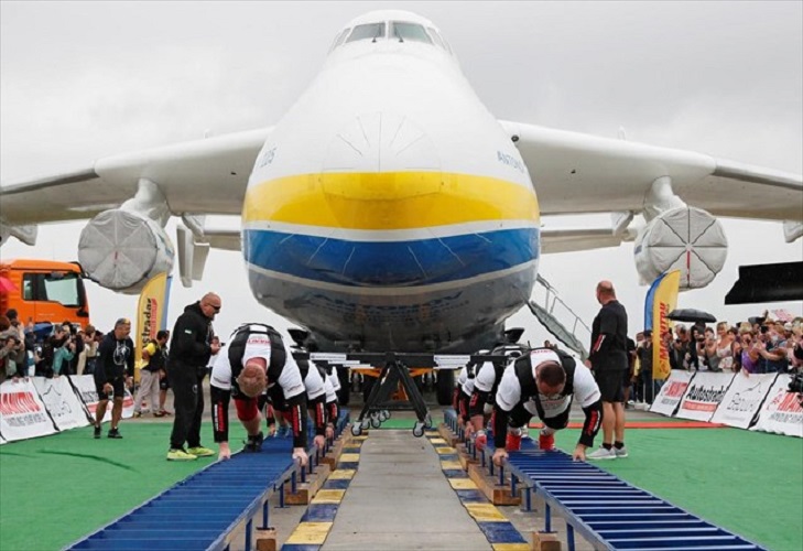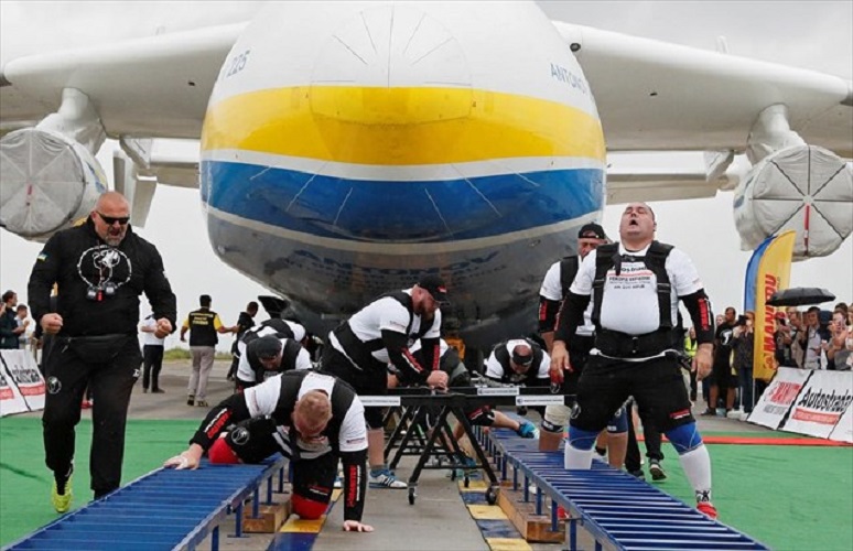 Οκτώ Ουκρανοί δυνατοί αθλητές κατάφεραν να σύρουν πάνω από τέσσερα μέτρα το μεγαλύτερο και βαρύτερο φορτηγό αεροσκάφος στον κόσμο, το «Mriya» Antonov-225, που ζυγίζει 285 τόνους.