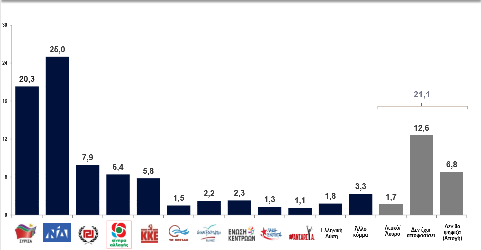 Στην πρόθεση ψήφου ο ΣΥΡΙΖΑ λαμβάνει 20,3%, η ΝΔ 25% και ακολουθούν Χρυσή Αυγή 7,9%, ΚΙΝΑΛ 6,4%, ΚΚΕ 5,8%, Ποτάμι, 1,5%, ΑΝΕΛ 2,2%, Ένωση Κεντρώων 2,3%, Λαϊκή Ενότητα 1.3%, ΑΝΤΑΡΣΥΑ 1.1%, Ελληνική Λύση 1,8% ‘Αλλο Κόμμα απαντά το 3,3%, Άκυρο/λευκό 1,7%, Δεν έχω αποφασίσει 12,6% Αποχή 6,8%