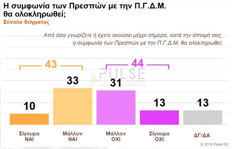 Η ελληνική γνώμη φαίνεται έντονα διαιρεμένη όσον αφορά την προοπτική ολοκλήρωσης της συμφωνίας των Πρεσπών. Συγκεκριμένα, το 44% των πολιτών εκτιμά ότι η συμφωνία δεν θα κυρωθεί οριστικά και από τις δύο χώρες, ενώ το 43% απαντά πως η συμφωνία θα φτάσει έως το τέλος.